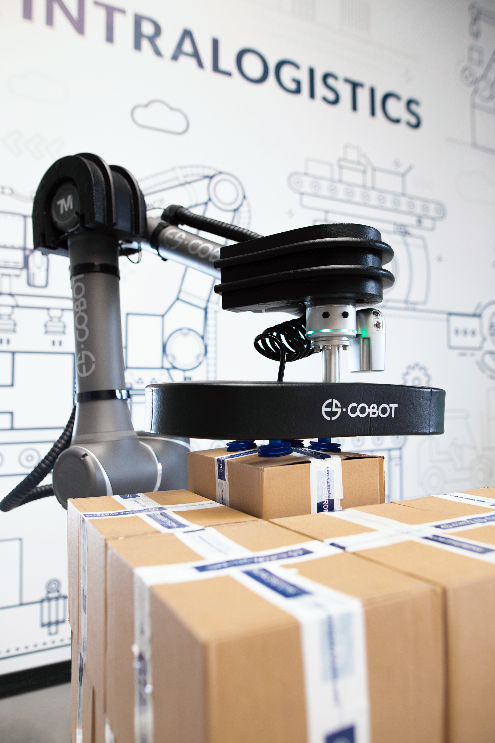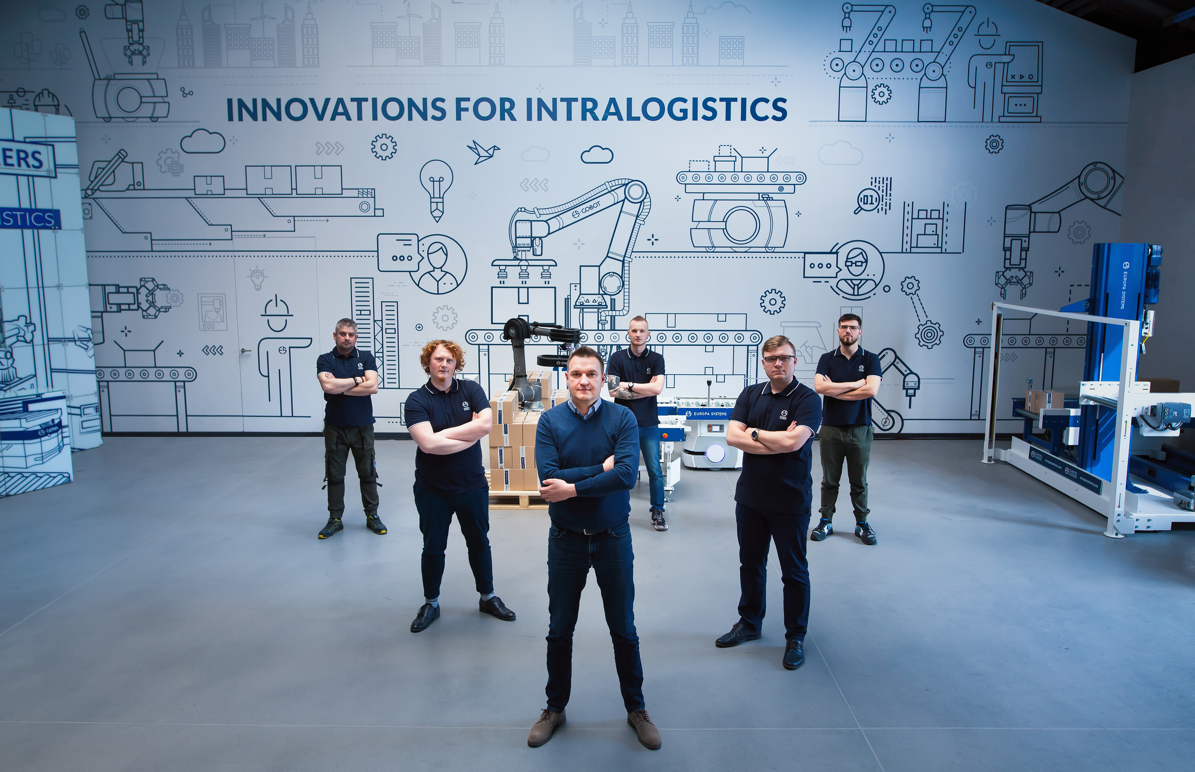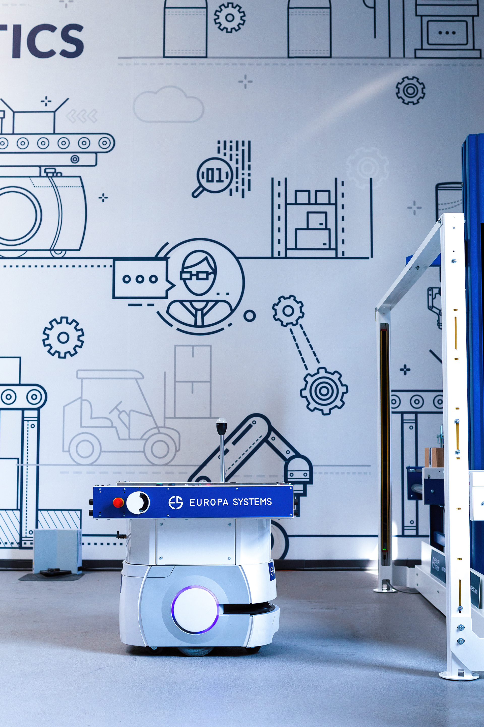 Sesja zdjęciowa z udziałem urządzeń do intralogistyki - transportu wewnętrznego w firmach. Es Cobot to robot, który grał główną rolę w sesji, obok inżynierów odpowiedzialnych za jego wdrożenie.