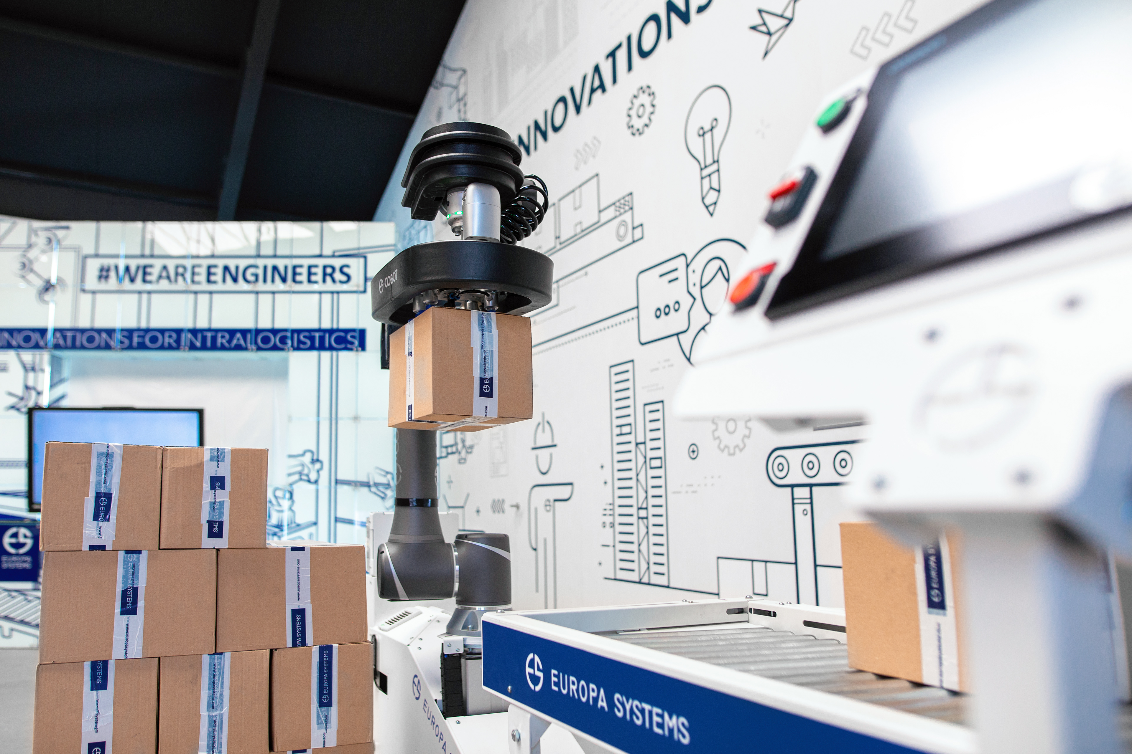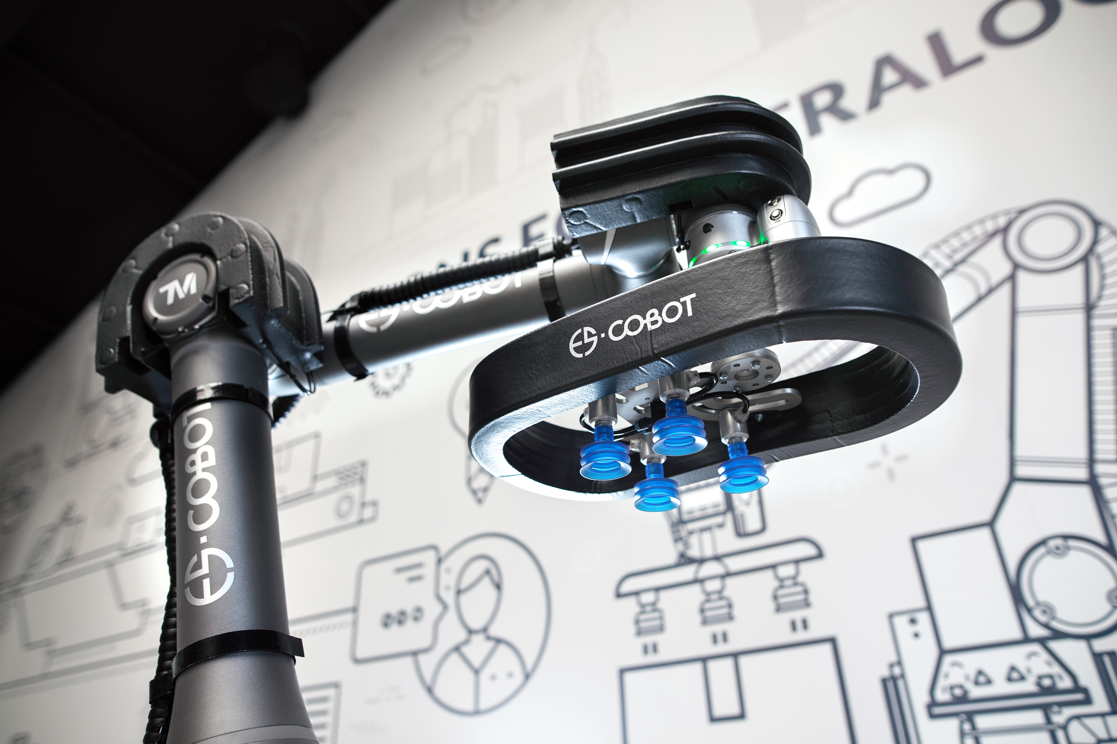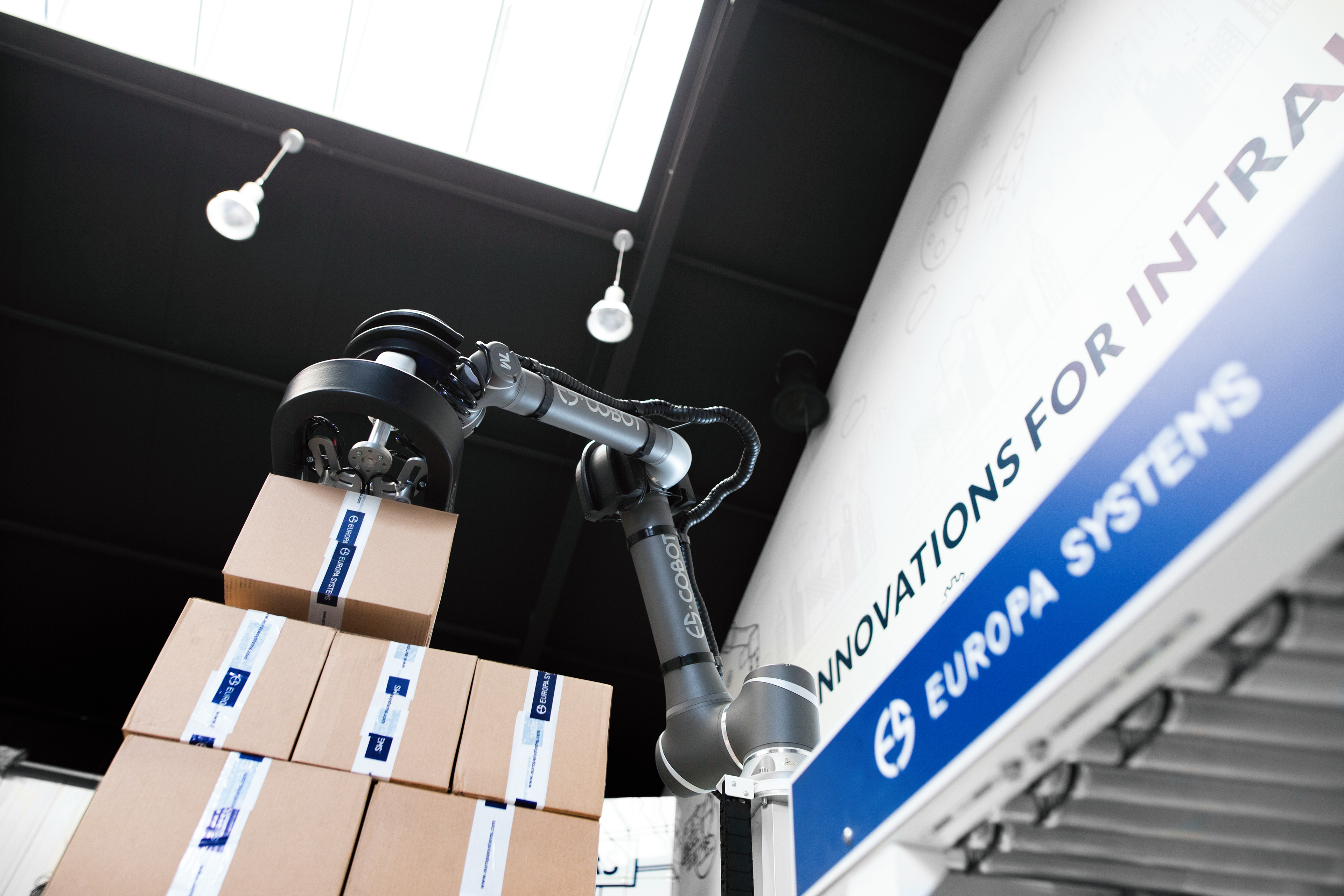 Sesja zdjęciowa z udziałem urządzeń do intralogistyki - transportu wewnętrznego w firmach. Es Cobot to robot, który grał główną rolę w sesji, obok inżynierów odpowiedzialnych za jego wdrożenie.